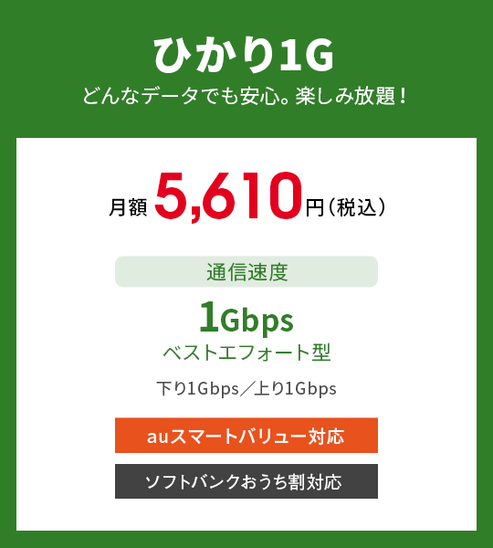 最大1Gbpsのスピード(ベストエフォート型)で安定感も抜群。大容量データも光にお任せして、快適なネットライフをお楽しみいただけます。